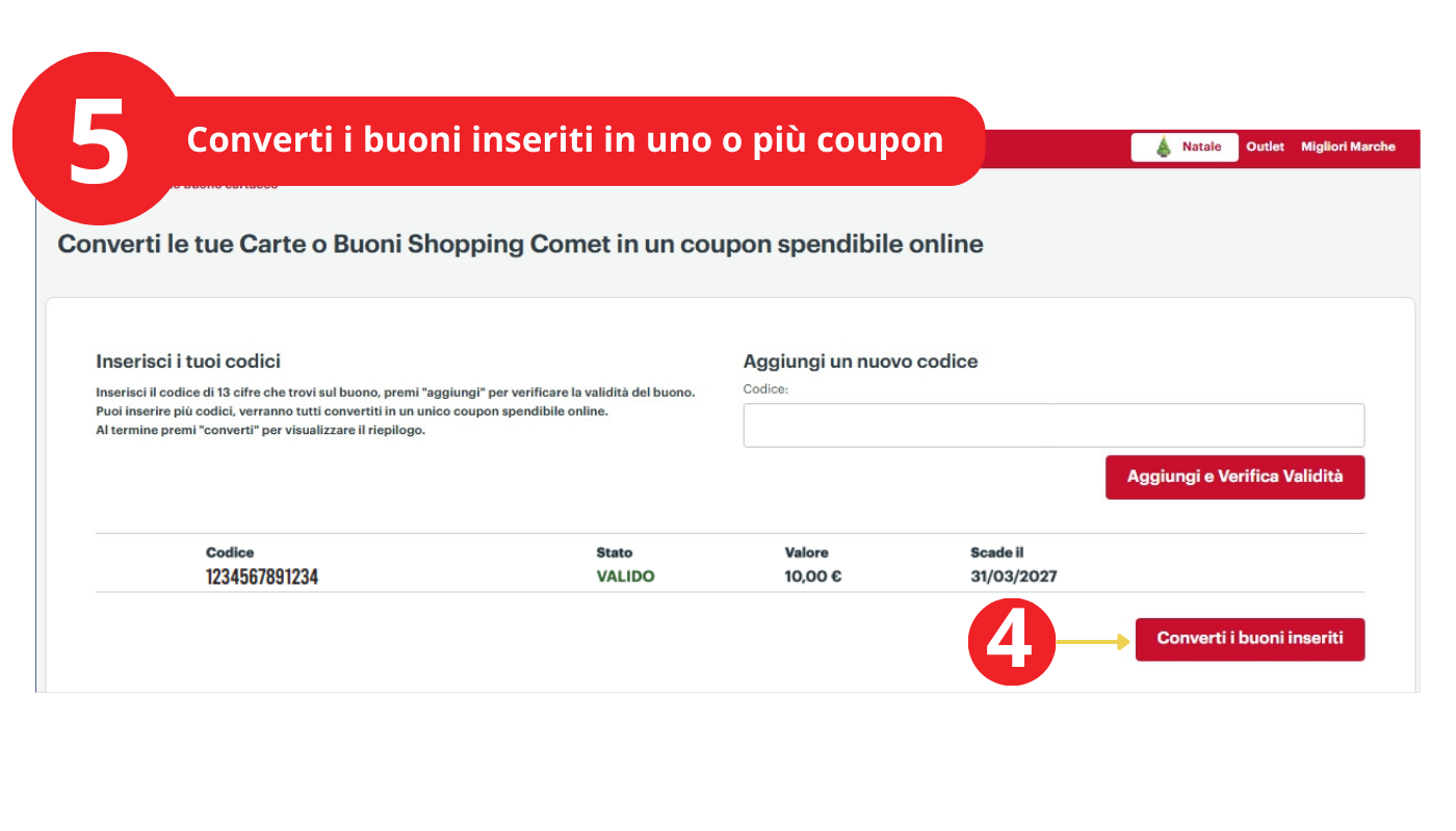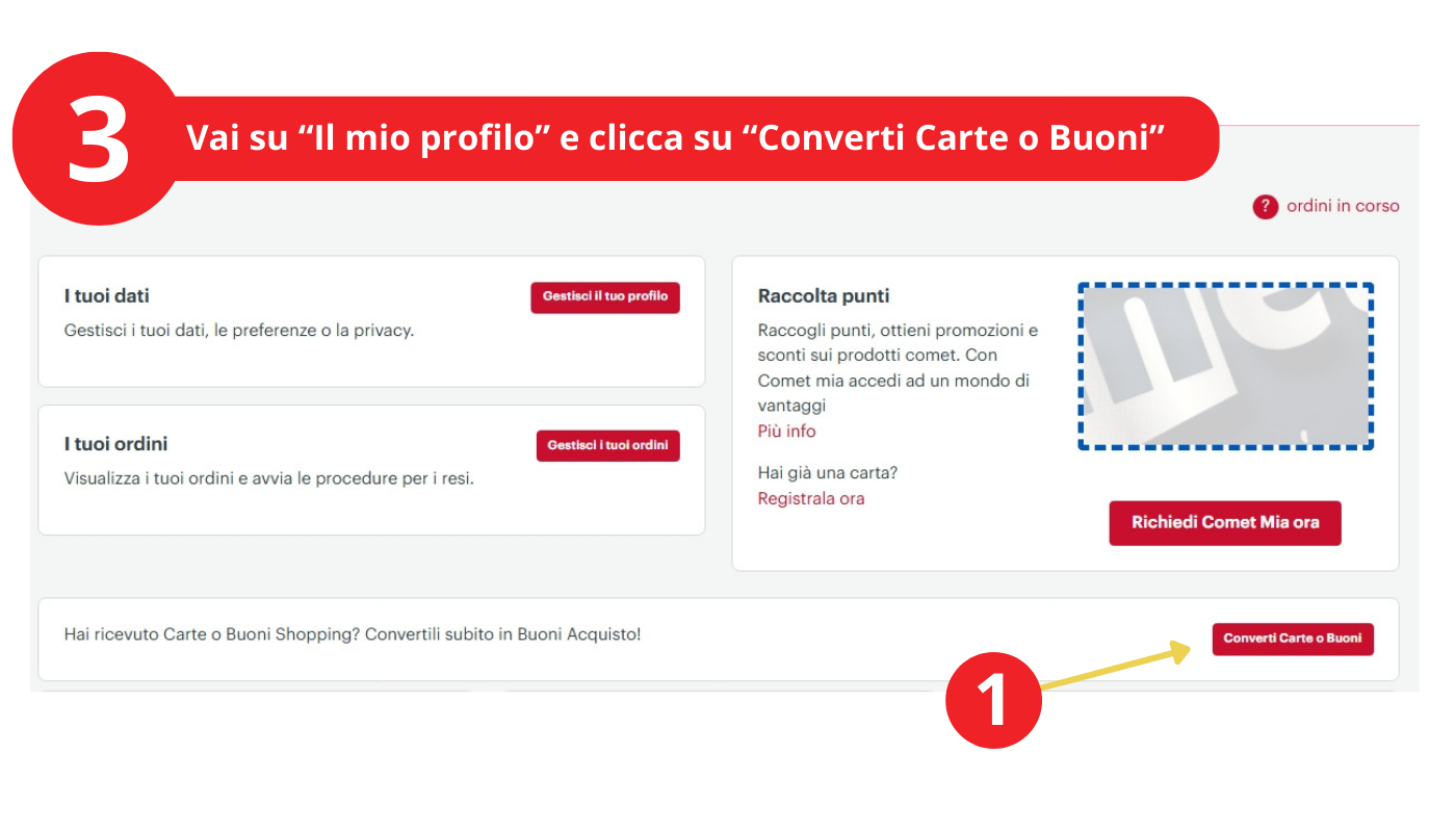 Puoi convertire i tuoi buoni shopping in un coupon digitale in autonomia, direttamente dalla tua area riservata cliccando su "Converti Carte e Buoni".