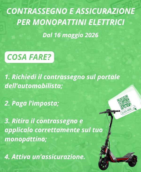 Dal 16 maggio 2026 entra in vigore l’obbligo di contrassegno e assicurazione per i monopattini elettrici. Per evitare multe è importante mettersi in regola, ma niente paura: la procedura è semplice e veloce. Segui la nostra guida e mettiti in regola senza pensieri.
